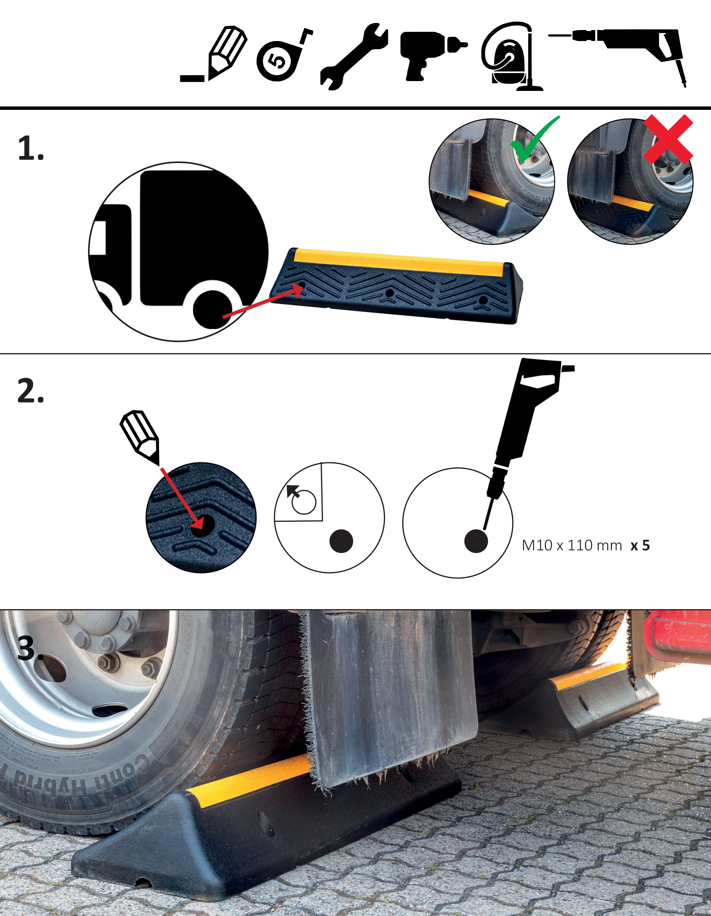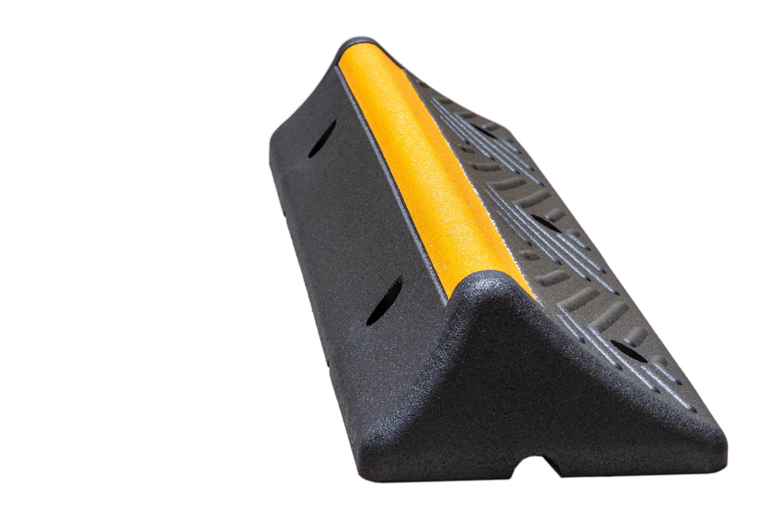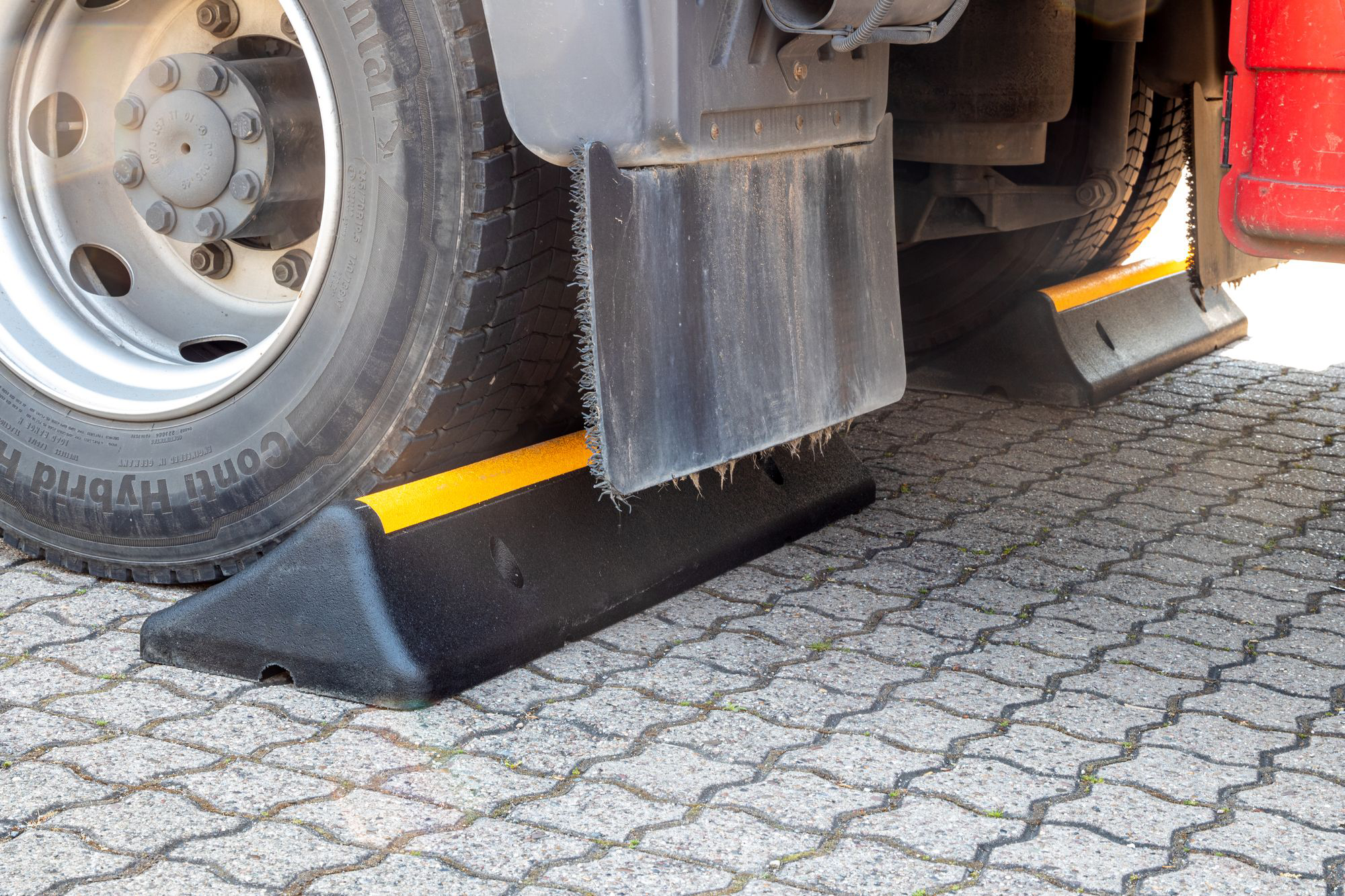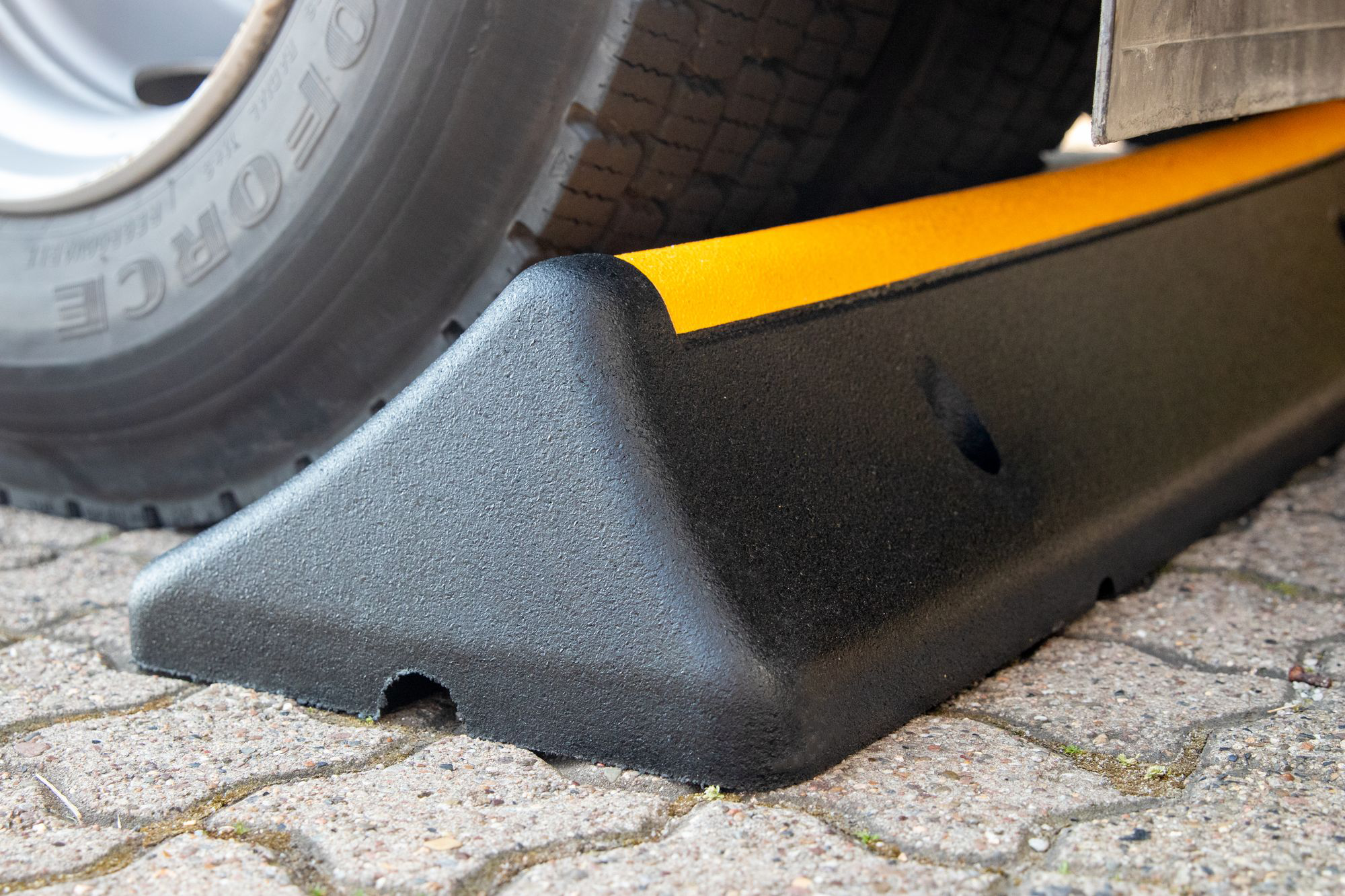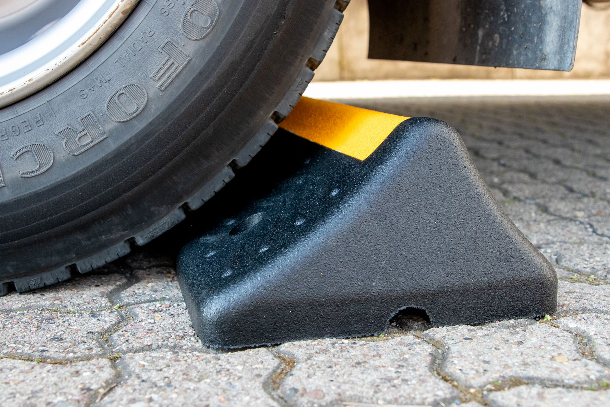 Wysokiej jakości gumowy separator/ogranicznik parkingowy przeznaczony jest pomoc przy parkowaniu i manewrowaniu dla samochodów ciężarowych, autobusów i innych dużych pojazdów. Blokada koła zapobiega uszkodzeniu pojazdów, budynków i maszyn, pozwalając pojazdowi toczyć się tylko do momentu, gdy opona zetknie się z progiem.