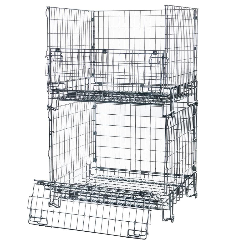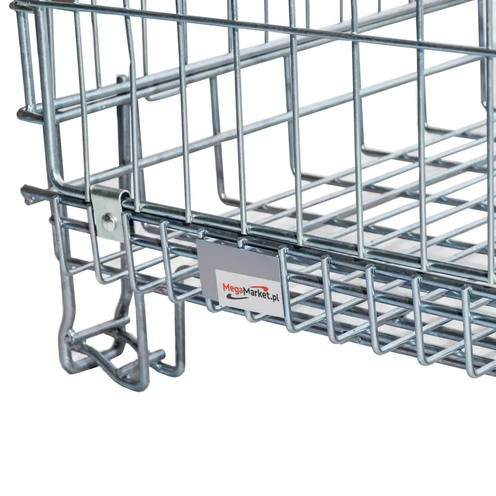 Pojemnik koszowy składany Mega-M ze stalowej siatki drucianej odpornej na uszkodzenia mechaniczne, zabezpieczonej powłoką galwaniczną, która chroni metal przed korozją. Nośnik magazynowy wyposażony jest w uchylne okno na dłuższym boku, które gwarantuje wygodny dostęp do wkładanego i wyjmowanego towaru. Koszopaleta służy do transportu i magazynowania towaru. Stosowane są również do przewożenia i magazynowania butelek z winem. Pojemnik magazynowy można załadować maksymalnie do 500 kg.
